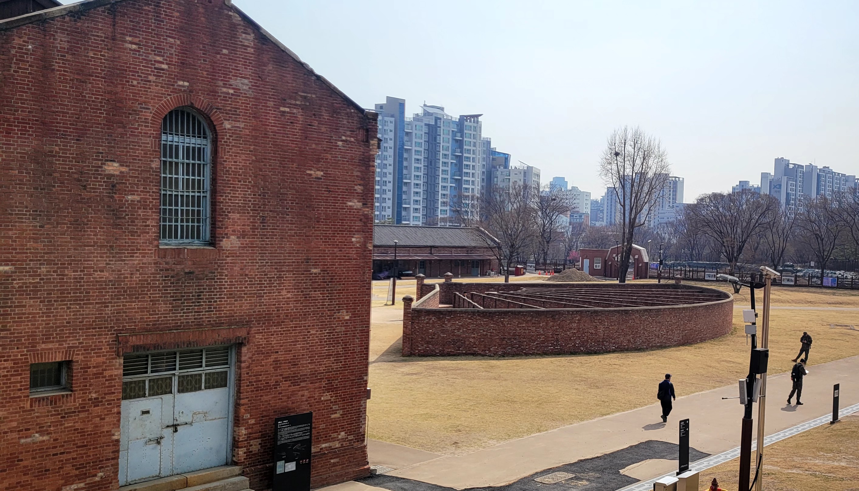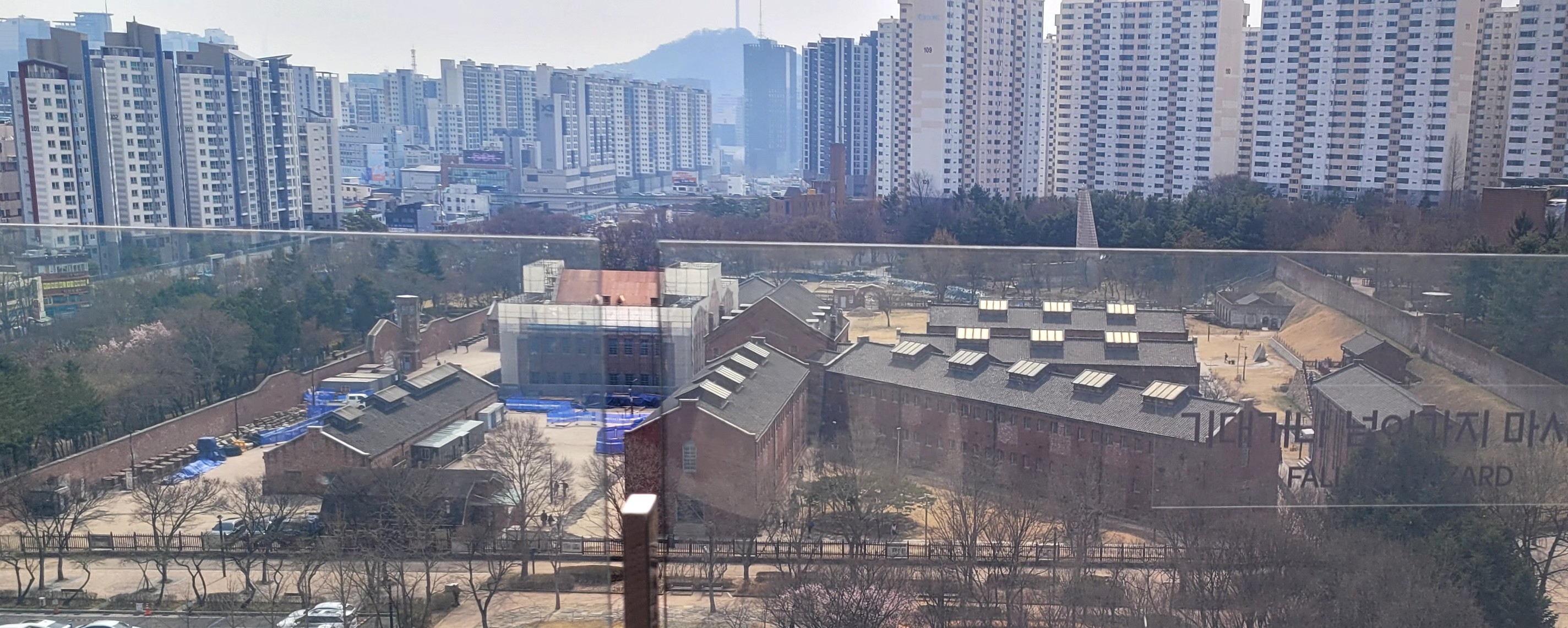 대한민국임시정부기념관 옥상에서 찍은 사진인데 처참했던 형무소 뒤로 현대식 아파트들이 벽지 처럼 무표정하다.