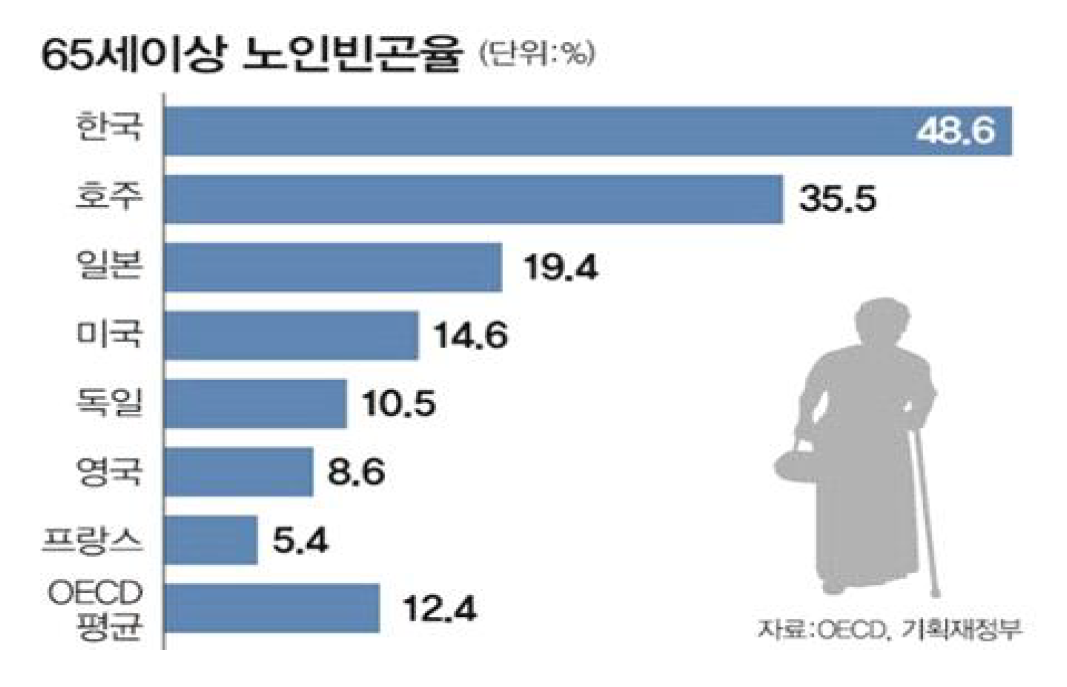 2023년 경제개발협력기구(OECD) 조사에서 노인 빈곤율 1위를 차지한 한국은 일하는 노인 비율이 가장 높은 편에 속한다. OECD는 한국이 2082년에는 노동 인구 1명이 노인 1명을 부양해도 모자랄 정도로 노인 인구가 급증할 것이라고 예측했다.