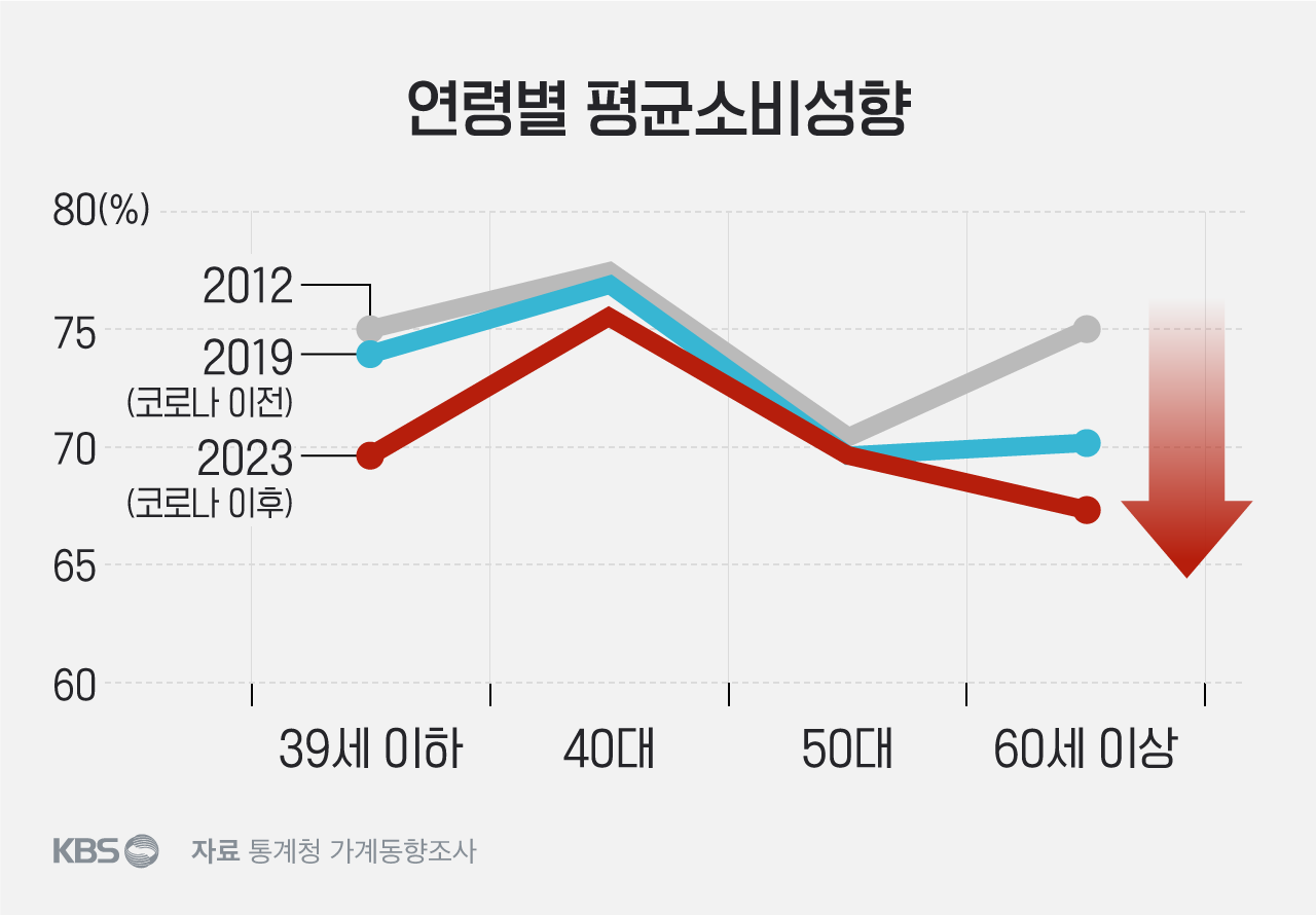 2012~2023년 중 60세 이상의 소비성향 하락폭은 75.0%에서 67.1%로 나타났다. 전체 연령 소비성향 하락 폭(74.7%70.7%)보다 크다. 통계청 가계동향조사를 보면 우리나라의 평균 소비성향은 전체적으로 하락 추세로 여기에 단일 세대로 규모가 가장 큰 2차 베이비부머가 은퇴 연령에 진입하면서 이런 전체 소비성향을 더 낮추는 요인으로 작용할 가능성이 있다는 게 한은의 분석이다.